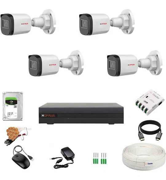 - Included Components: CP PLUS 2.4MP Built-in Mic Bullet Camera 4 Nos, 2.4MP 4CH DVR 1 Nos (Including Mouse & Adapter), 1TB Hard Disk 1 Nos, Clocite CCTV Coaxial Cable 1 Roll, Clocite 4Ch SMPS With Power Card 1 Nos, Screw Hole Covers Stickers & Screws For All Cameras, BNC 8 Nos, DC Connectors 4 Nos, and HDMI Cable 1 Nos.